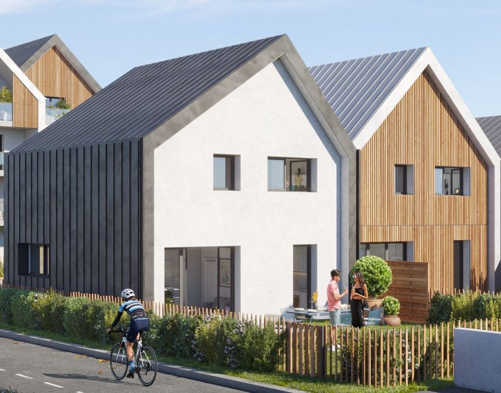 Le bardage bois et les différentes teintes du bardage métallique viennent rythmer la suite des façades, tout en dotant chaque maison d’une personnalité propre.