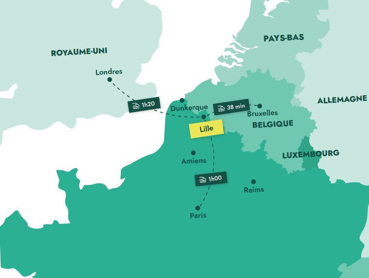 Le bus 7 est à 200 m avec un accès direct au métro et au centre de Lille. Une station V'Lille est à proximité avec 12 km de pistes cyclables. Un arrêt du futur tramway Lille-Lesquin est prévu à 700m, avec une mise en service prévue pour 2035.